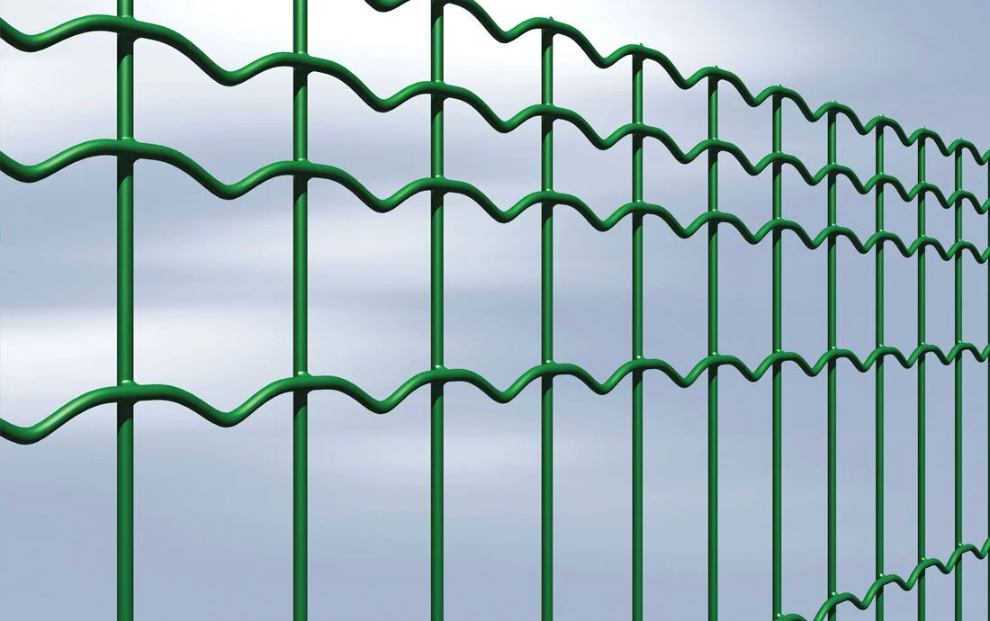 This fencing is made from electro-welded plastic-coated wire with a triple selvedge. The vertical (linear) and horizontal (crimped) wires of the electro-welded mesh are made in zinc coated steel.